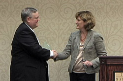 Toby Nixon accepts congratulations from NFOIC President Lucy Dalglish after being inducted into the State Open Government Hall of Fame at the 2012 FOI Summit in Madison, WI, on Saturday, May 12.