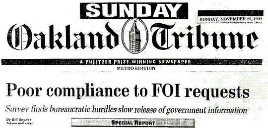 The act was meant to give the public the right to see government documents, a right that previously existed in name only. But civil liberties activists and many journalists say the fight for the right to know is still being waged.Hoping to find out how well the act is working, the Oakland Tribune and the First Amendment Project, an Oakland-based watchdog group, surveyed 30 Bay Area city, county and regional governments and agencies by giving each a test request for information.Here are the major findings of the survey: