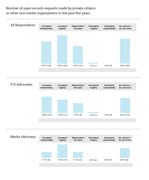 In the earlier 2009 survey, 60 percent of NFOIC members surveyed reported that litigation on FOI issues had "fallen dramatically" in recent years. In the companion survey conducted at that time, 53 percent of media lawyers in the MLRC Defense Counsel Section said that media resources dedicated to forcing compliance with open government laws had "decreased slightly" or "decreased substantially" in the prior two to five years.